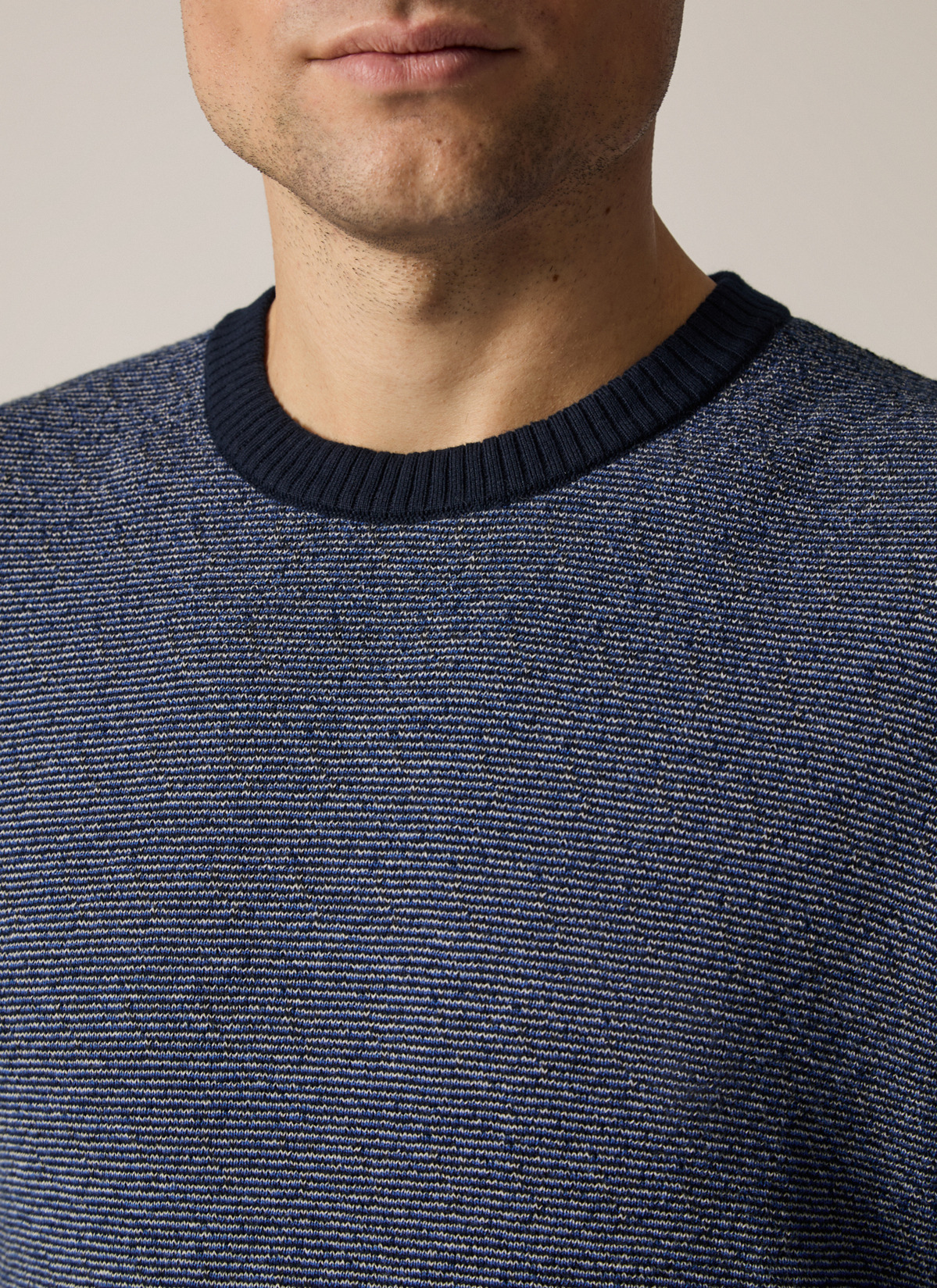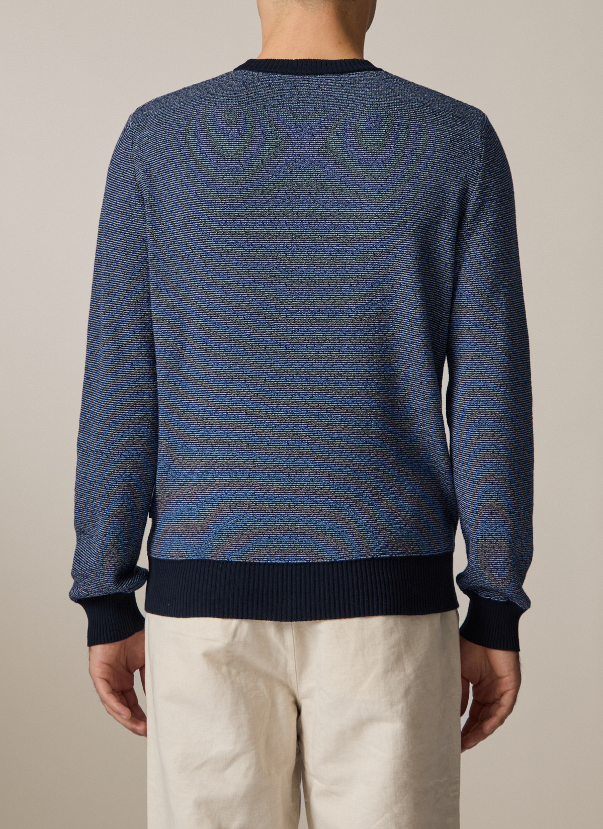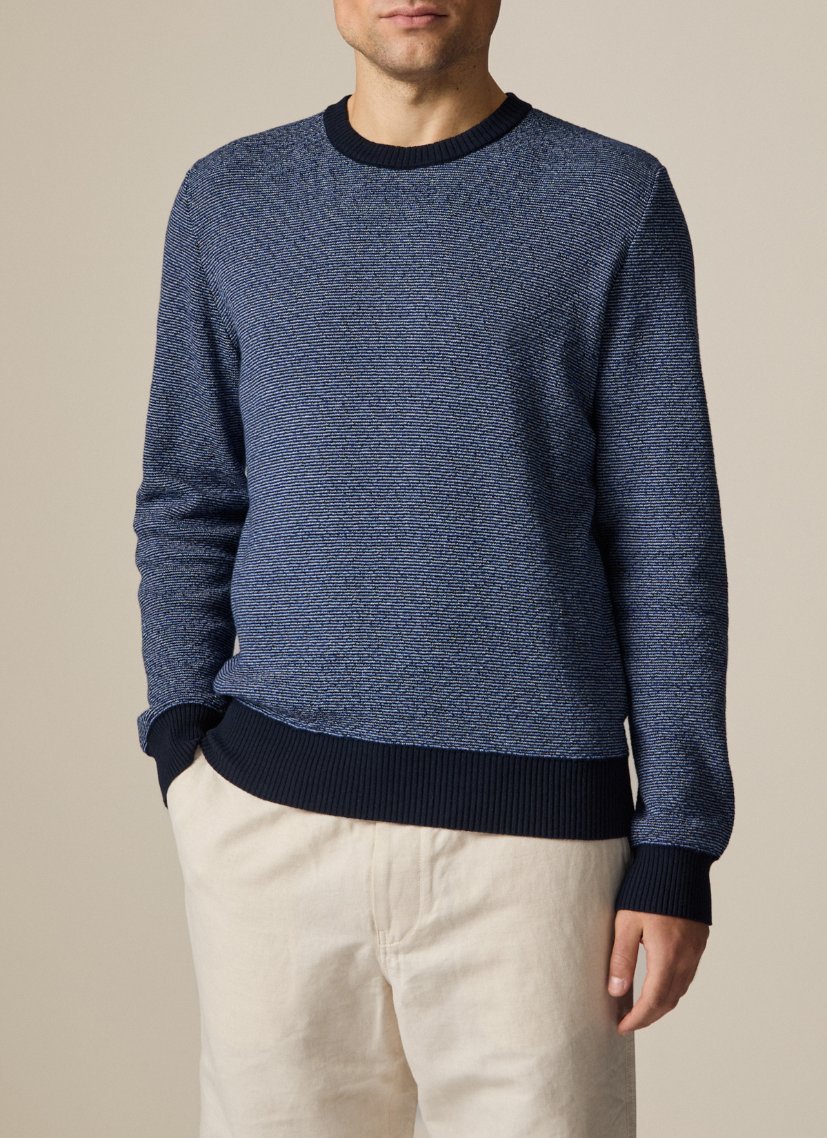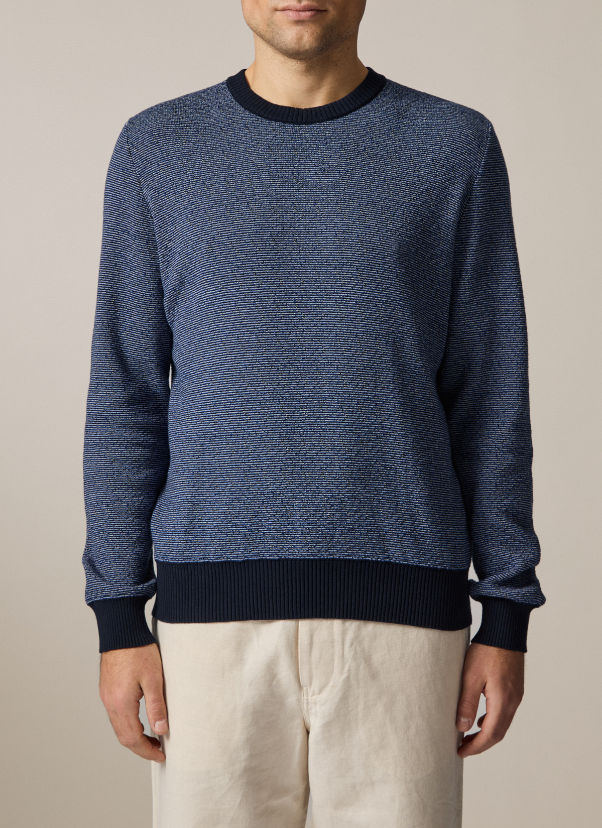 Ein Basic Pullover mit modernem Twist! Der Pullover zeigt sich im Regular Fit mit Rundhalsausschnitt. Durch die verschieden farbigen Garne entsteht ein markantes Muster, welches dem Pullover einen besonderen Charakter verleiht. Die uni farbenen Rippenbündchen an Saum und Ärmeln bilden einen harmonischen Kontrast. Material: gefertigt aus Baumwolle bietet der Pullover einen hervorragenden Tragekomfort und ist besonders pflegeleicht . Haptik: kernig und weich im Griff.