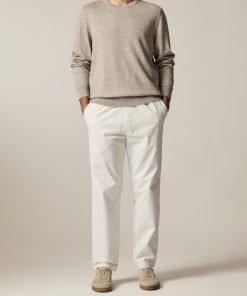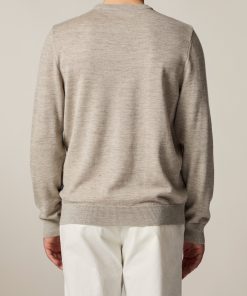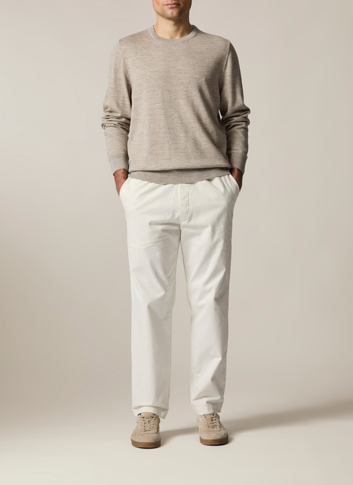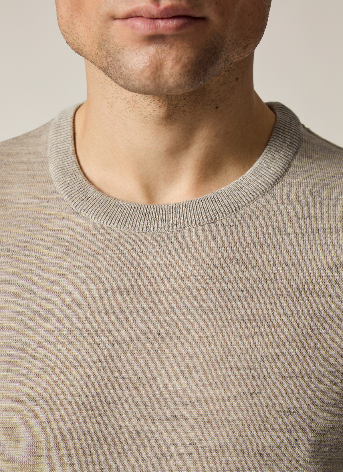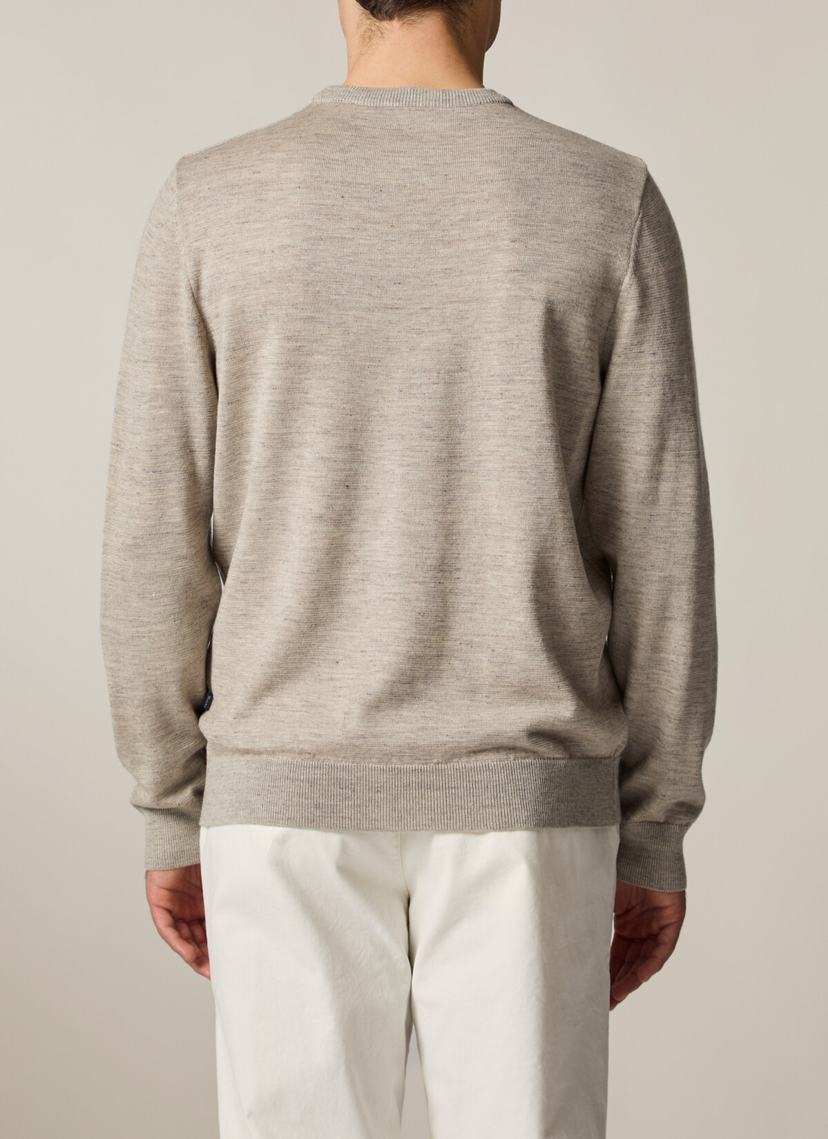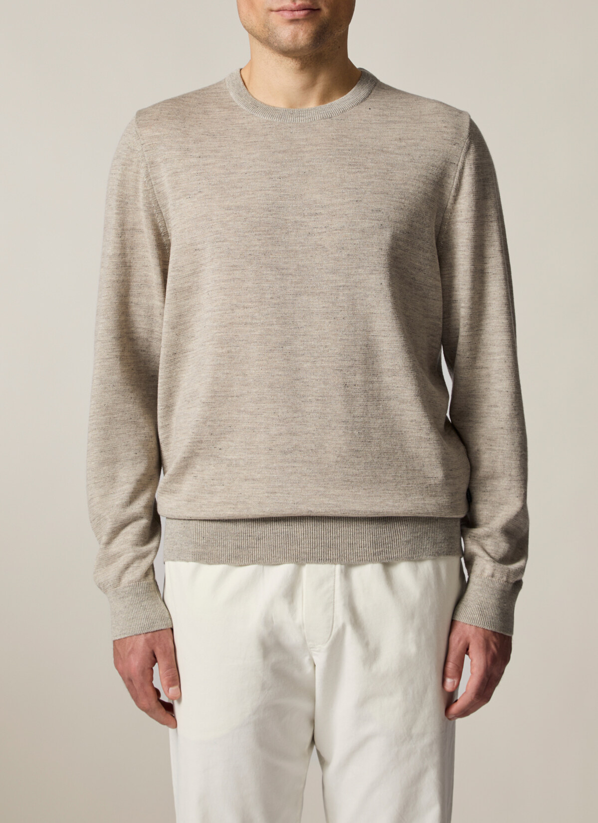 Der Pullover im Regular Fit zeigt sich mit Rundhalsausschnitt und Rippendetails an Saum und Kragen. Der Pullover überzeugt durch seinen klassischen, sportlichen Look. Material: die Materialmischung aus Merinowolle und Leinen kombiniert die weiche, temperaturregulierende Eigenschaft der Merinowolle mit der leichten, atmungsaktiven Textur von Leinen, was für einen hohen Tragekomfort sorgt. Haptik: weich und leicht griffig. Styling-Tipp: für einen eleganten Look mit einer farblich passenden Stoffhose oder alltagstauglich zu Jeans kombinieren.