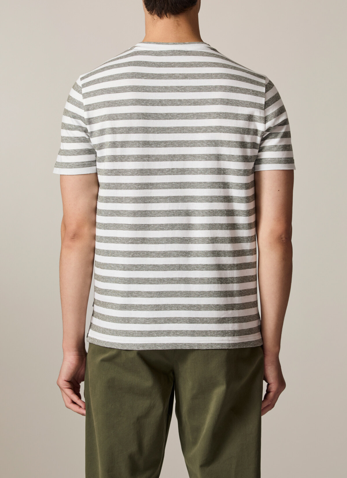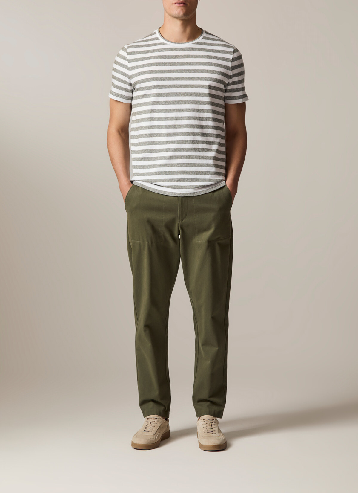 Das T-Shirt im Modern Fit präsentiert sich mit dezenten, horizontalen Streifen, die dem klassischen Design eine moderne Note verleihen. Material: gefertigt aus einer weichen Mischung aus Baumwolle und Leinen, bietet es einen hohen Tragekomfort, ist atmungsaktiv, leicht und feuchtigkeitsregulierend. Haptik: leicht und kühl. Styling-Tipp: Perfekt kombiniert mit einer lässigen Jeans oder Shorts für einen entspannten, aber eleganten Look.