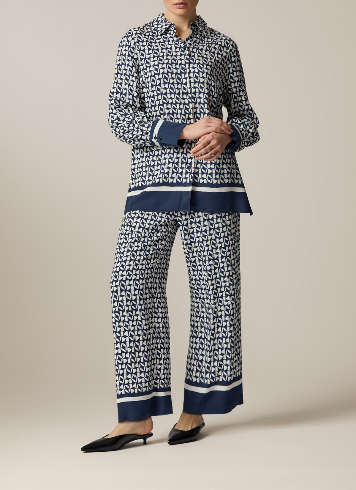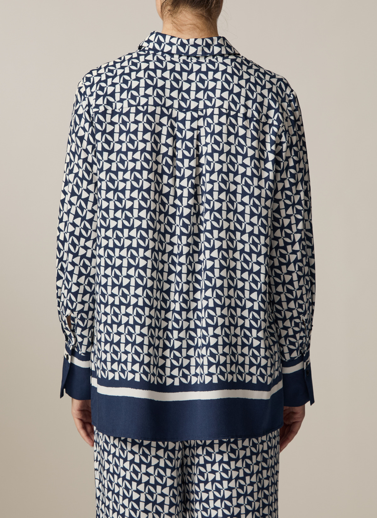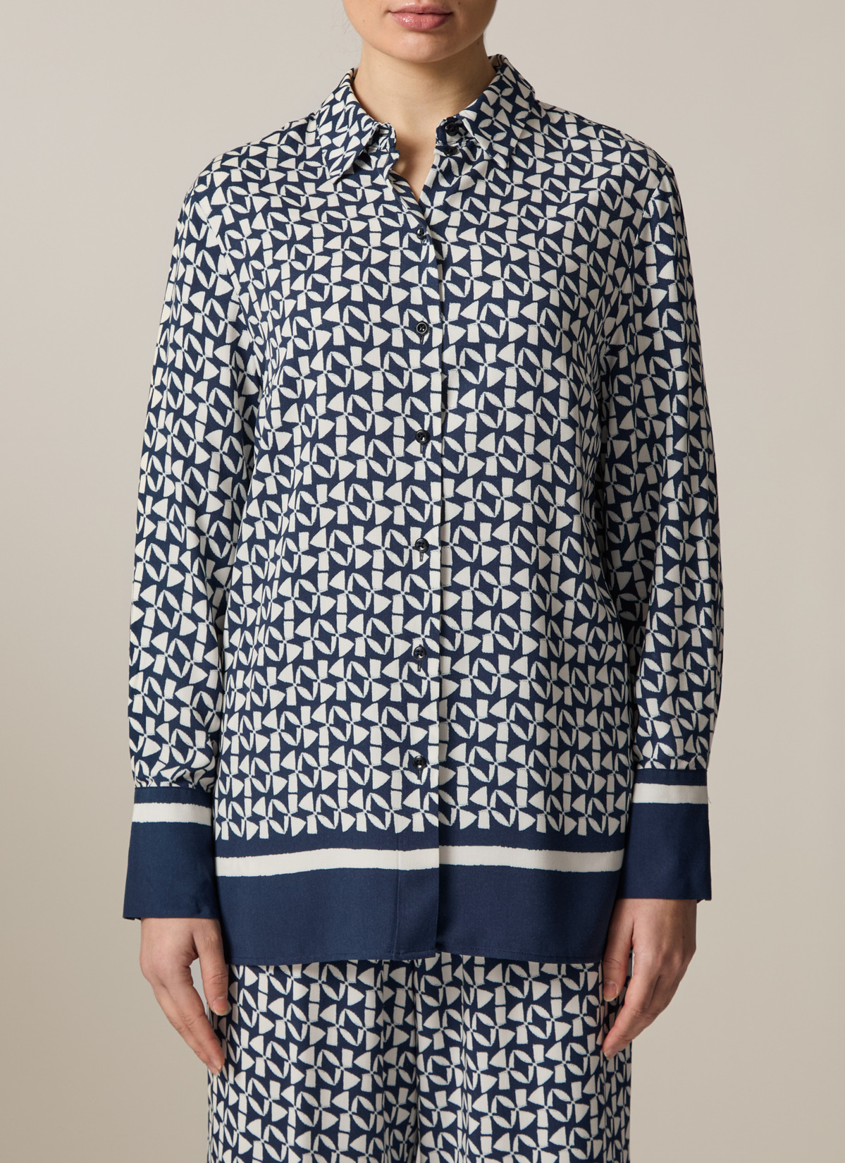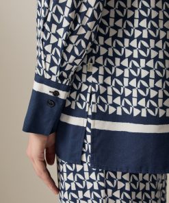 Die Twill Bluse im Straight Fit zeigt sich mit farbigem Statement Bund und Manschetten. Das aufgedruckte Muster macht die Bluse zu einem absoluten Einzelstück. Material: zu 100% aus Viskose gefertigt ist die Bluse besonders hautfreundlich und anschmiegsam. Haptik: glatt und kühl im Griff. Styling-Tipp: kombiniert im Set mit der passenden Hose (Art. Nr.: 156401) wirkt der Look besonders elegant.