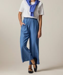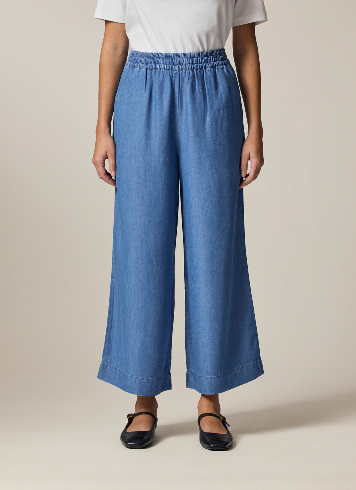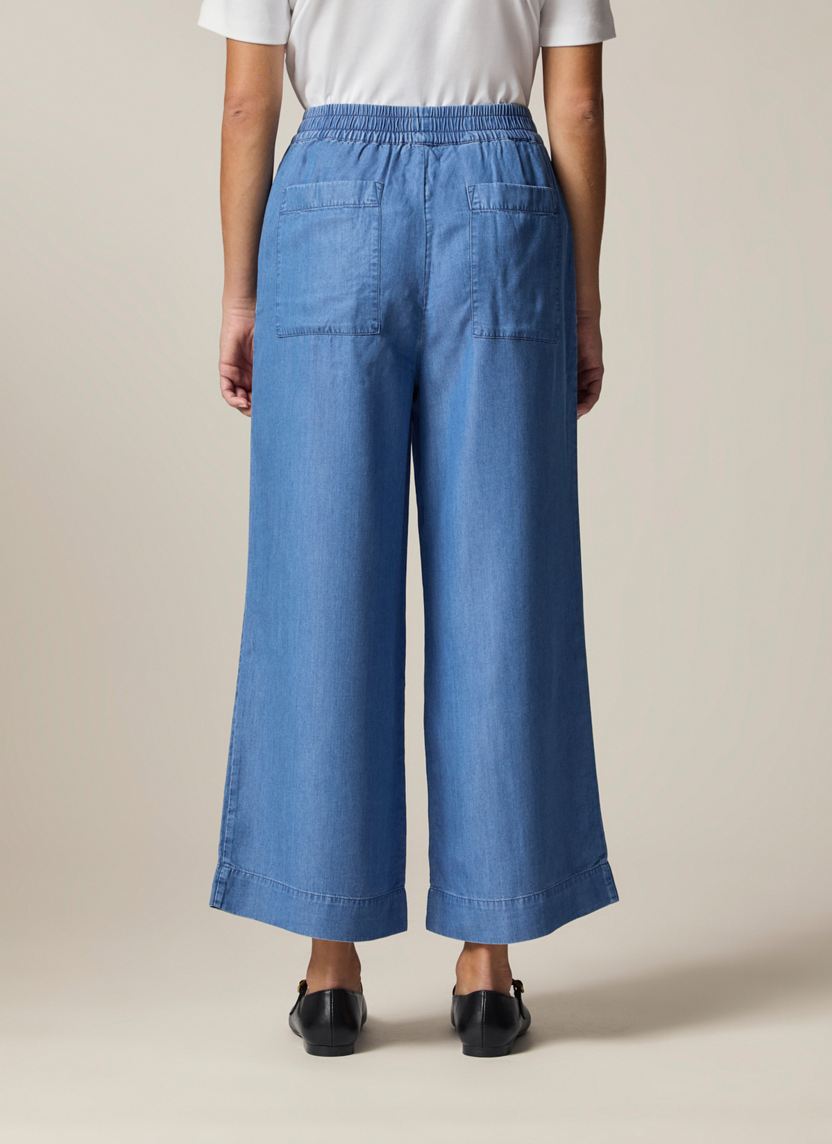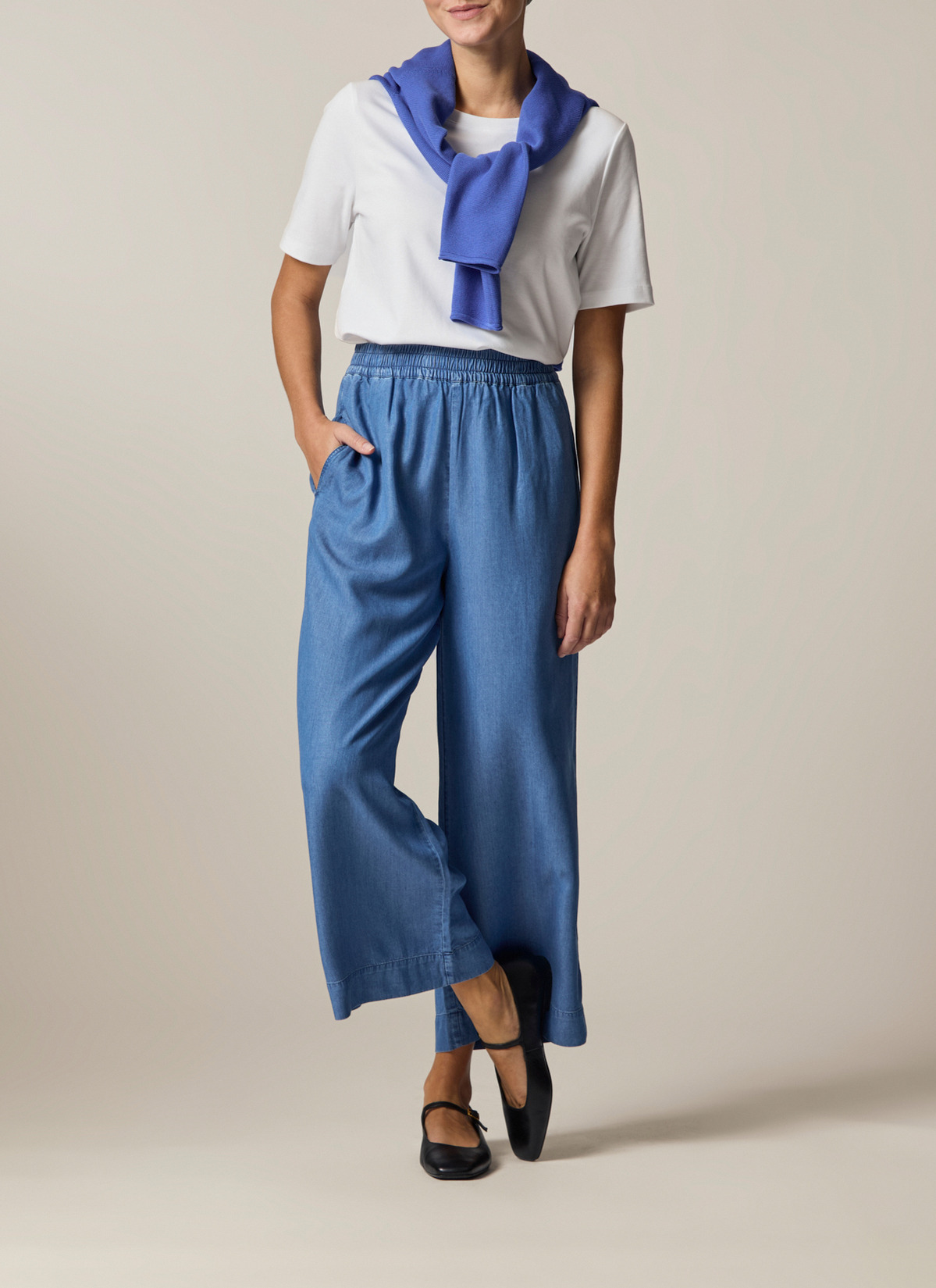 Die Culotte im Regular Fit zeigt sich in Denim Optik mit seitlichen Eingriffstaschen sowie zwei aufgesetzten Taschen auf der Rückseite. Der bequeme Gummibund sorgt für Tragekomfort. Material: zu 100% aus Lyocell gefertigt ist die Hose besonders hautfreundlich und Temperatur ausgleichend. Haptik: weich und leicht im Griff. Styling-Tipp: kombiniert im Set mit der passenden Bluse (Art. Nr.: 148300) wirkt der Look besonders stimmig.