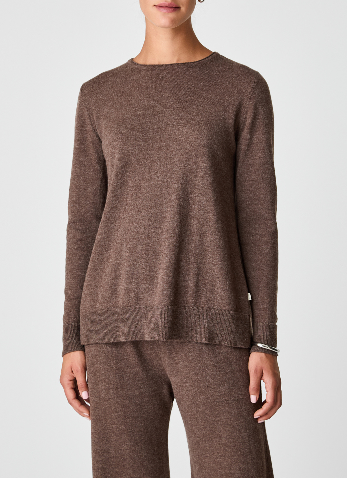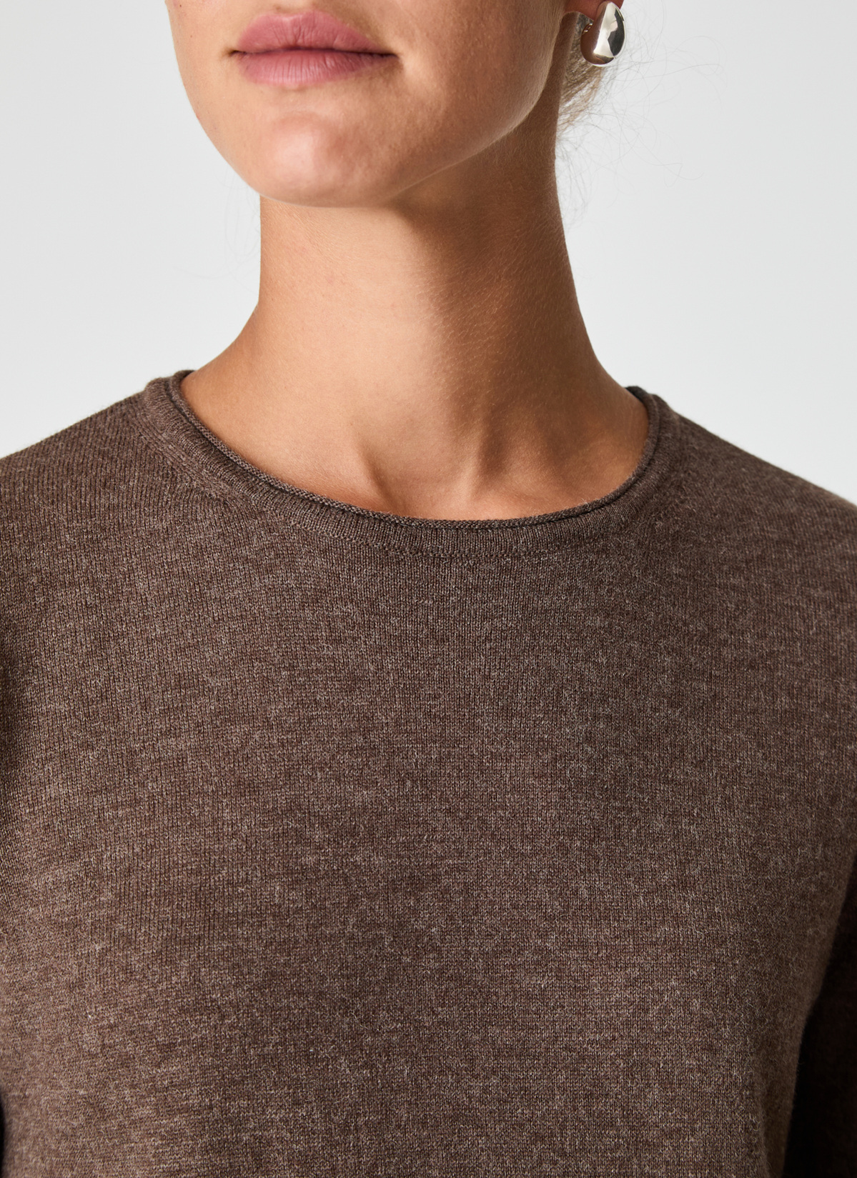 Der Moderne Klassiker mit besonderen Details. Der Rundhalspullover zeigt sich mit Rollkanten an Hals und Ärmeln sowie einer eleganten Rückenfalte. Material: die hochwertige Geelong-Wolle ist mulesingfrei und wird in Italien zum Premiumgarn versponnen. Haptik: cleanes, klassisches Maschenbild mit weichem Wollgriff. Hochwertige Verarbeitung mit handgekettelten Nähten und elastischen Bündchen. Styling-Tipp: Besonders Modern wirkt der Look Ton in Ton mit der passenden Hose (Art. Nr. 353600).