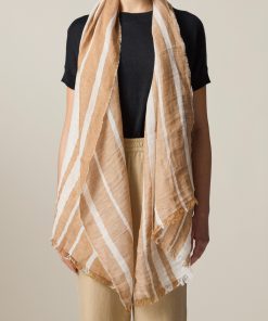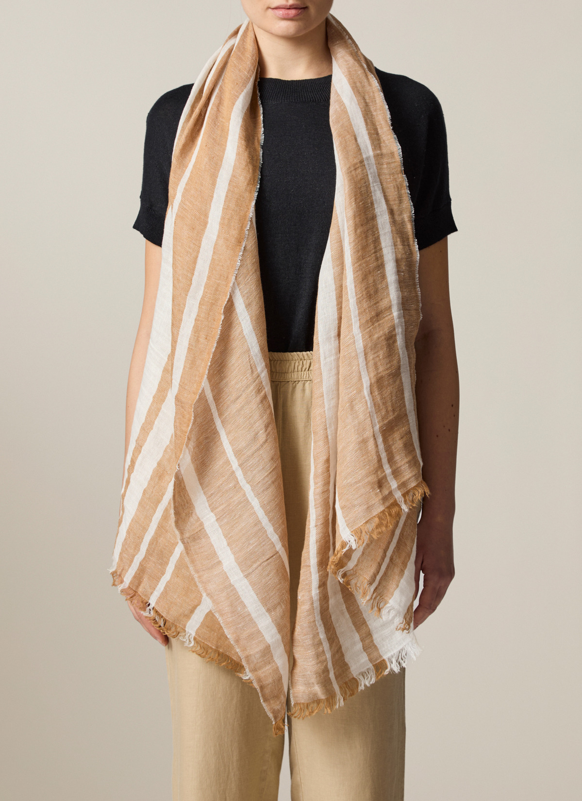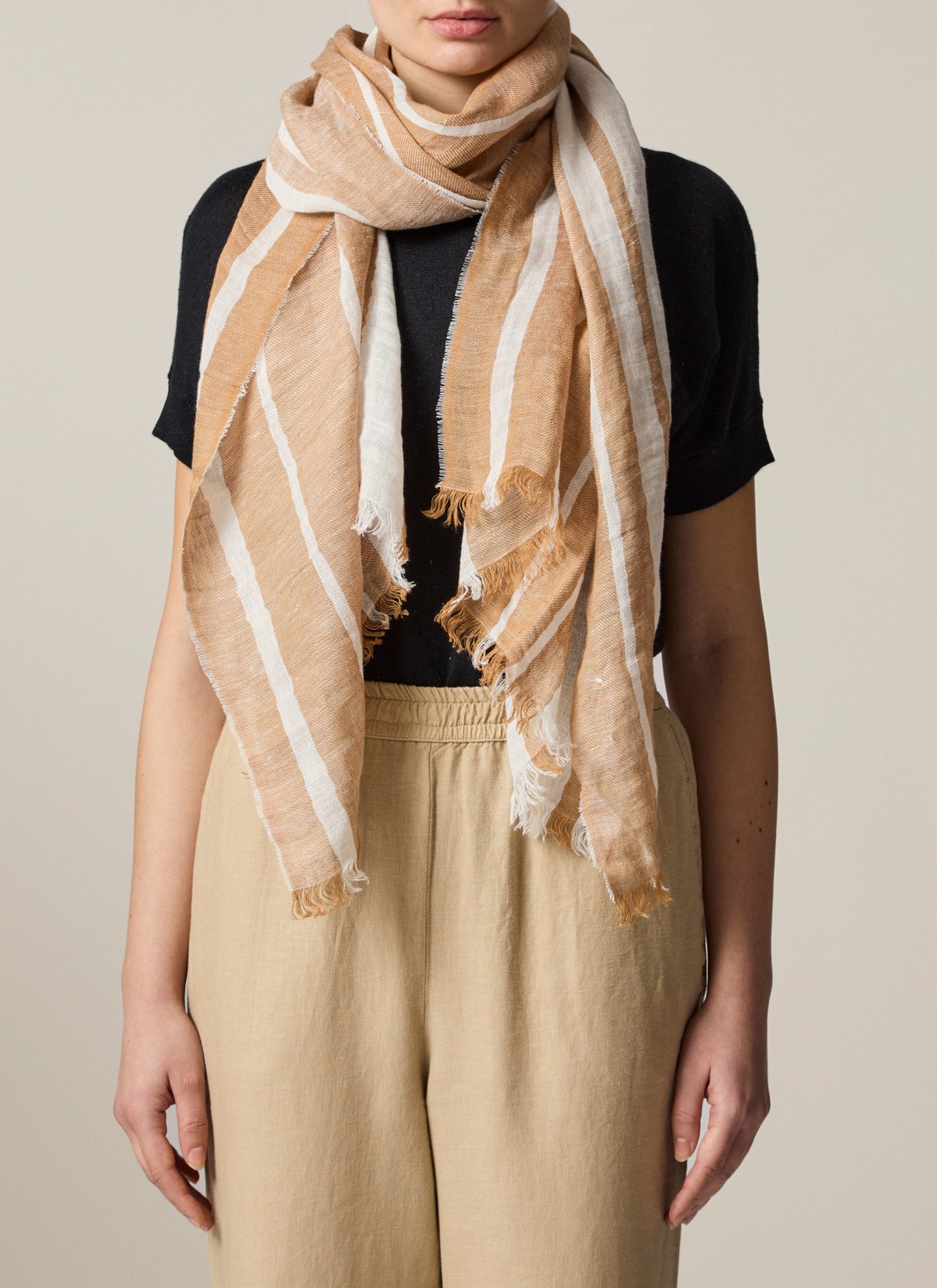 Der Schal zeigt sich in klassischem Streifenmuster. Gefertigt aus 100% Leinen ist er wunderbar leicht und ideal für warme Tage. Haptik: griffig und kühl.