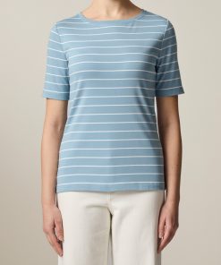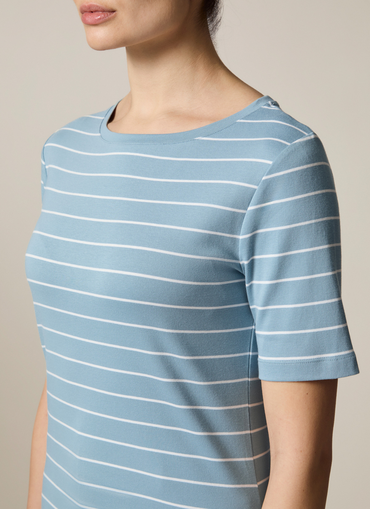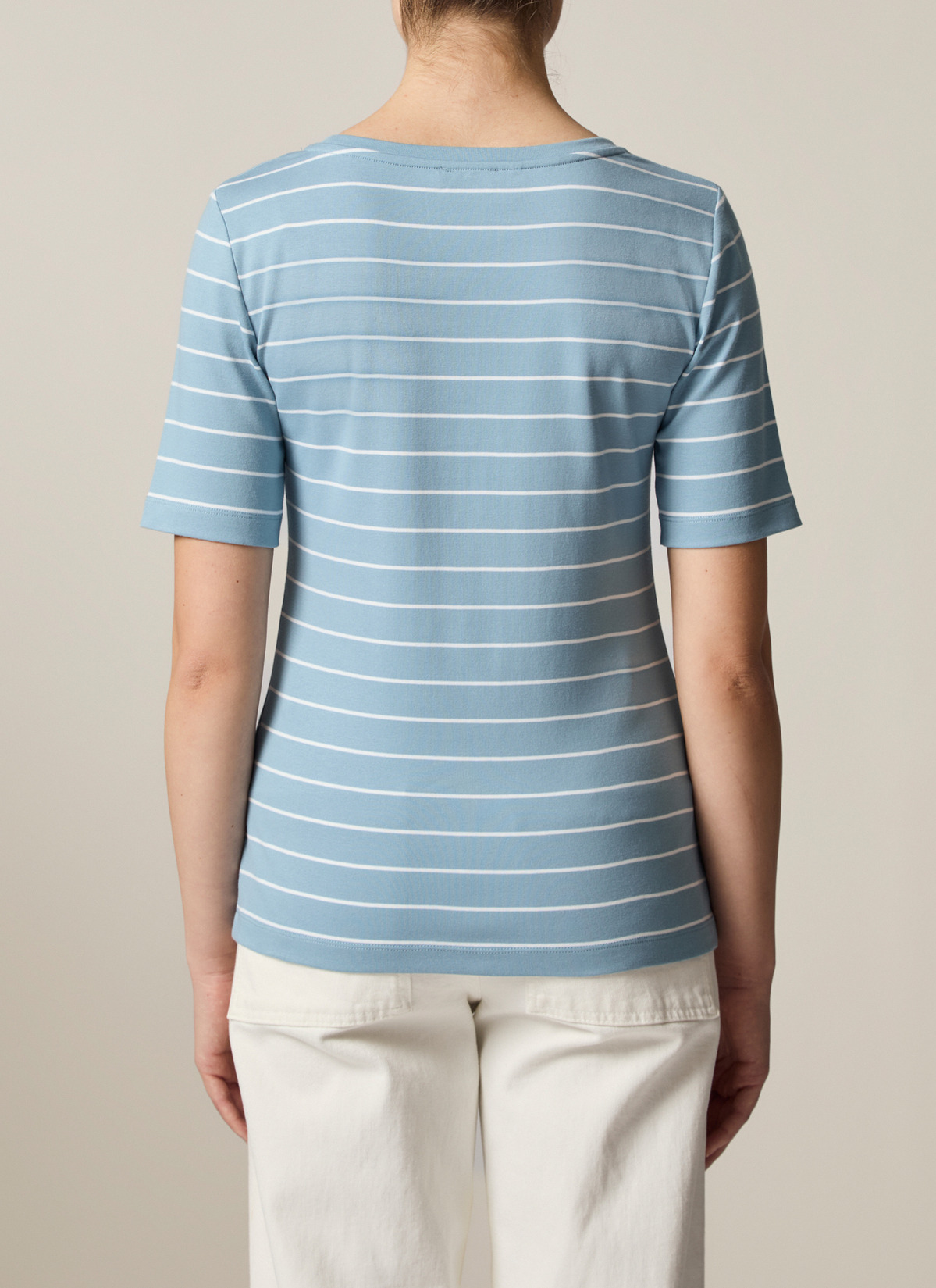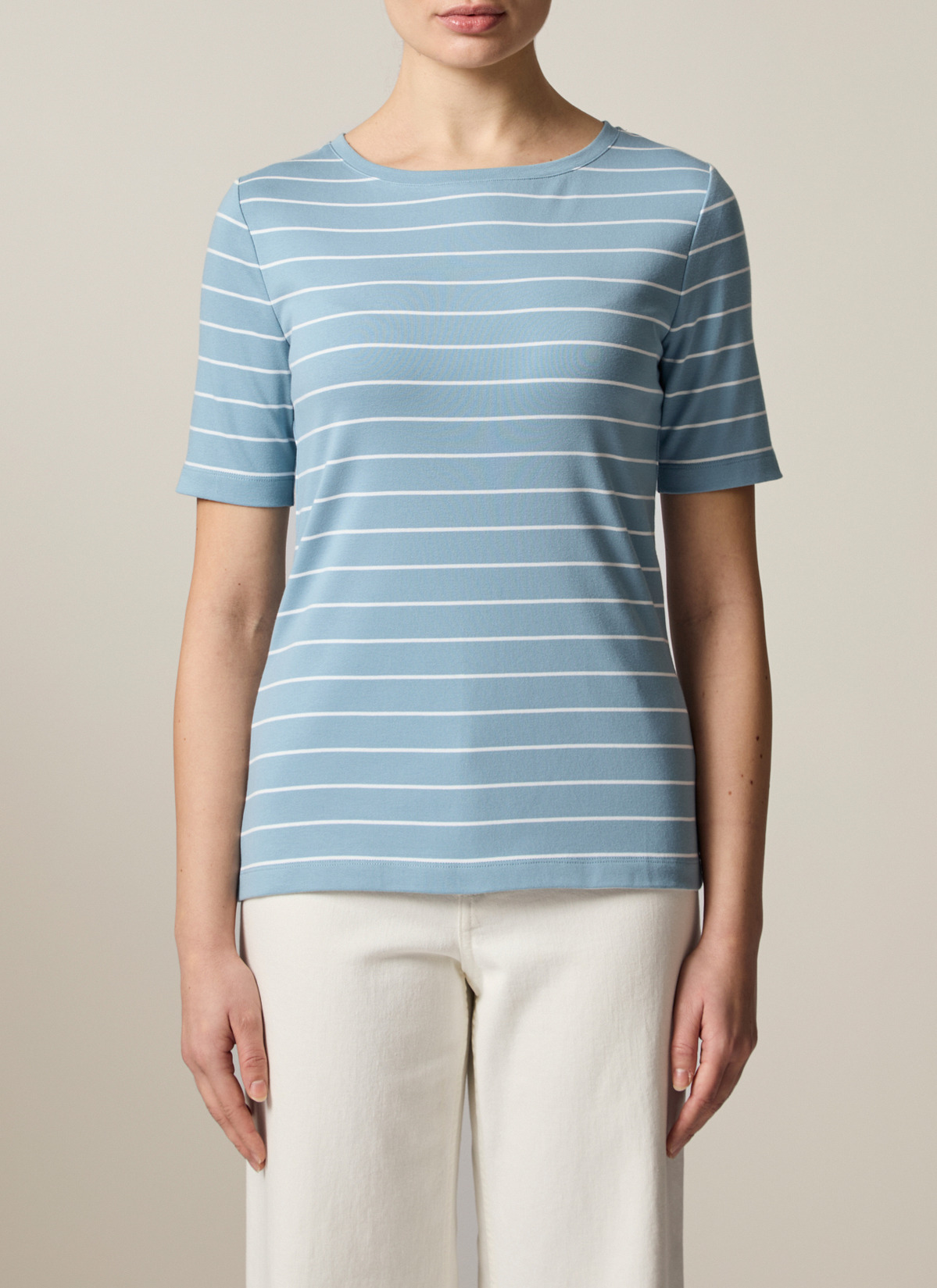 Lieblings-Produkt: Gestreiftes Shortsleeve mit dezentem U-Boot Ausschnitt. Die Materialmischung aus Baumwolle und Elasthan macht es besonders bequem und pflegeleicht. Das Shirt überzeugt dank seiner hochwertigen Verarbeitung. Bleibt auch nach vielen Wäschen in seiner Form. Styling-Tipp: eignet sich aufgrund seiner eng anliegenden Passform hervorragend als Unterzieh-Shirt für Pullover und Cardigans.