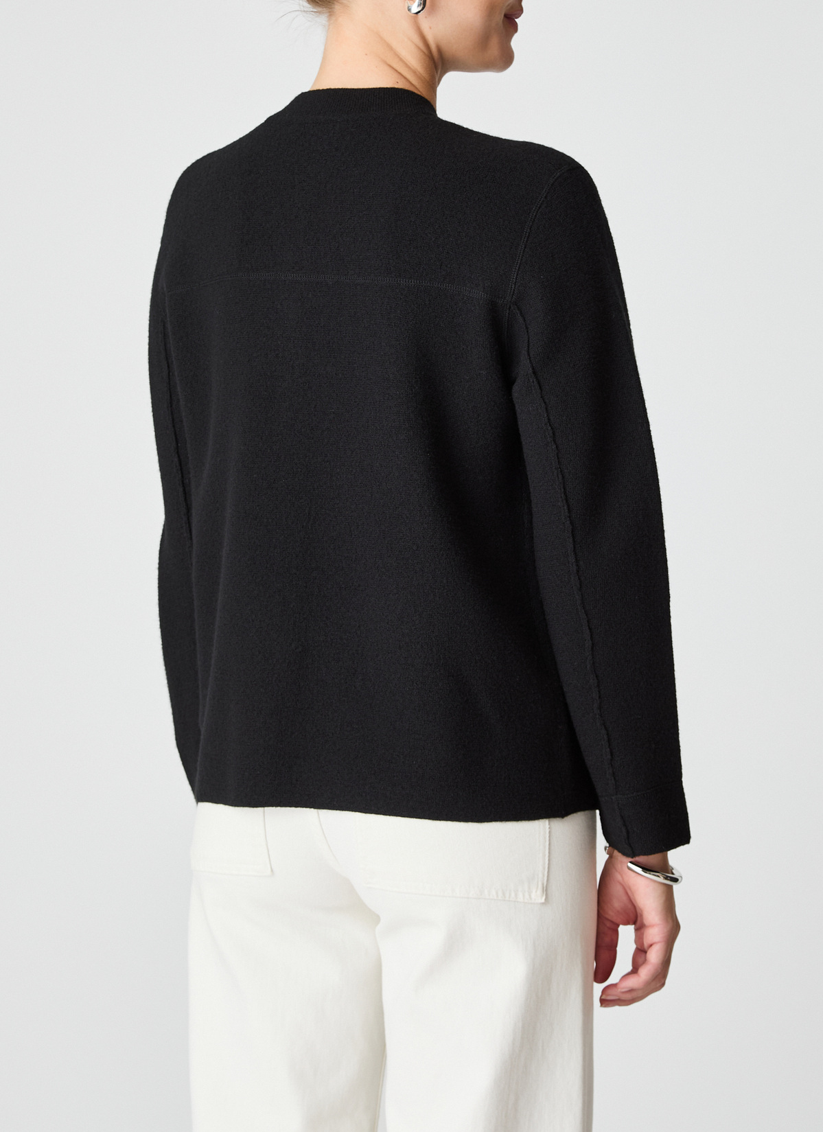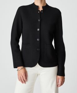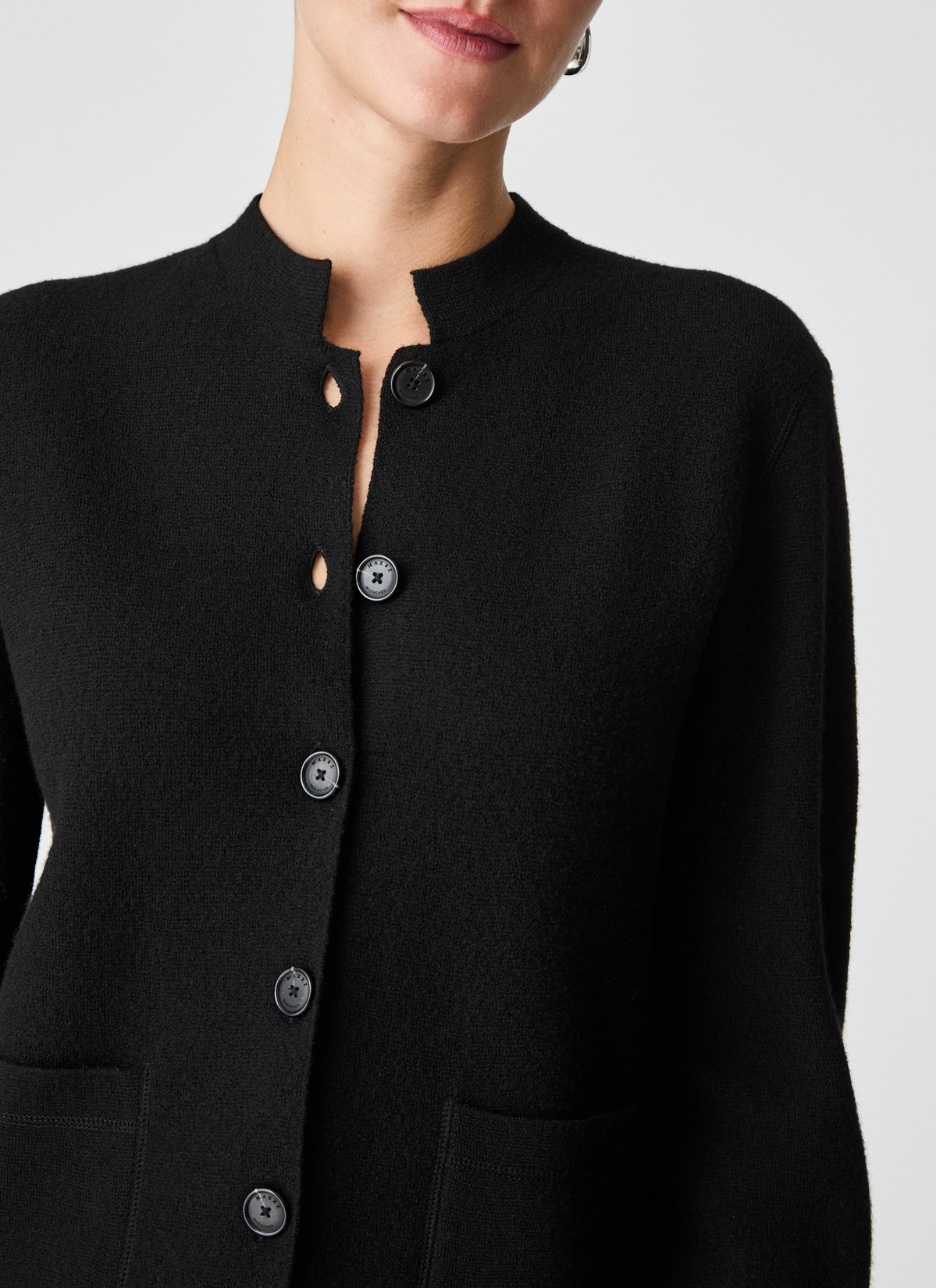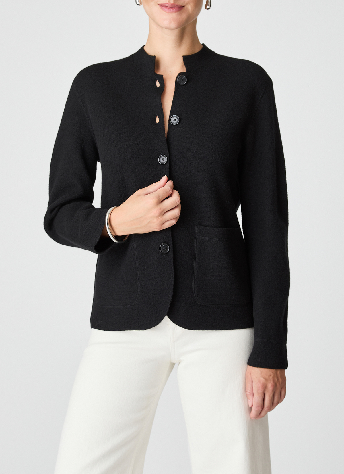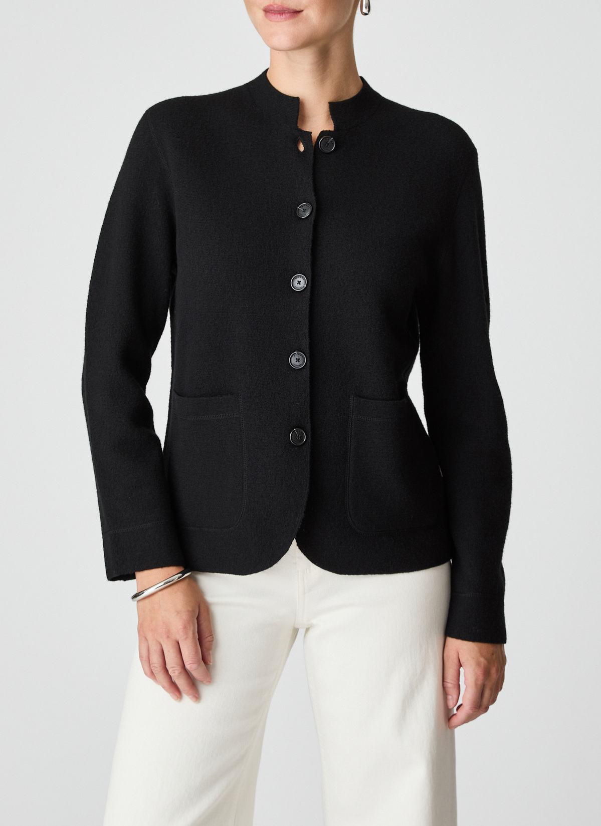 Verleihen Sie Ihrem Look zeitlose Eleganz mit diesem edlen Strickblazer aus reiner Merinowolle. Der Blazer ist angenehm weich, temperaturausgleichend und dennoch formstabil durch die hochwertige Boiled Wool Qualität. Der moderne Stehkragen und die markante Knopfleiste setzen stilvolle Akzente, die Sie sowohl im Alltag als auch zu besonderen Anlässen perfekt kleiden. Mit abgerundetem Saum und aufgesetzten Taschen bietet das Modell praktische Details und eine schmeichelhafte Silhouette. Der Regular Fit sorgt für bequemen Sitz und hohen Tragekomfort, ideal für anspruchsvolle Frauen, die Stil und Qualität schätzen. Entdecken Sie ein Kleidungsstück, das modischen Anspruch und Wohlgefühl perfekt verbindet.