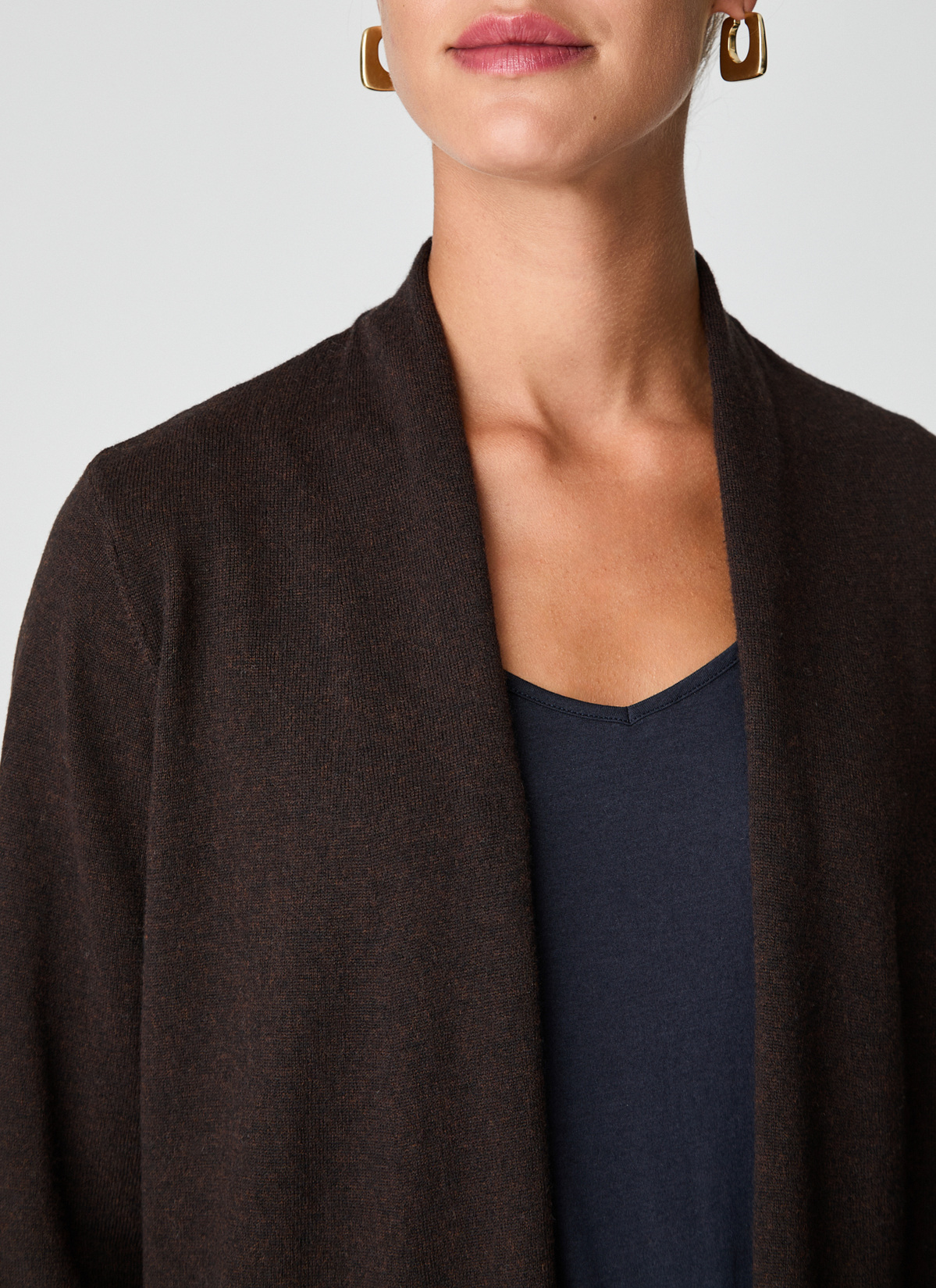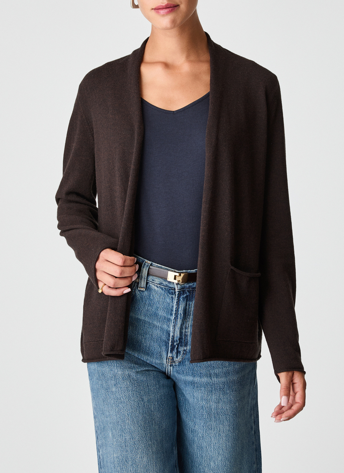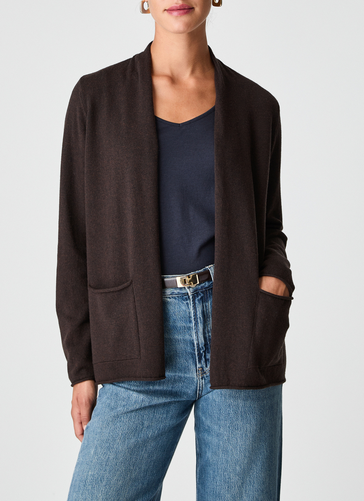 Kuschelig weiche Geelong-Wolle! Offene Strickjacke mit zwei aufgesetzten Taschen und hochwertiger Geelong Qualität. Material: die hochwertige Geelong-Wolle ist mulesingfrei und wird in Italien zum Premiumgarn versponnen. Haptik: klassisches Maschenbild mit leichtem und softem Wollgriff. Tragegefühl: leicht und angenehm wärmend. Hochwertige Verarbeitung mit handgekettelten Nähten und elastischen Bündchen. Styling-Tipp: ganz nach dem Motto „Ton in Ton“ kombiniert man aktuell mehrere Strickteile in einem Outfit.