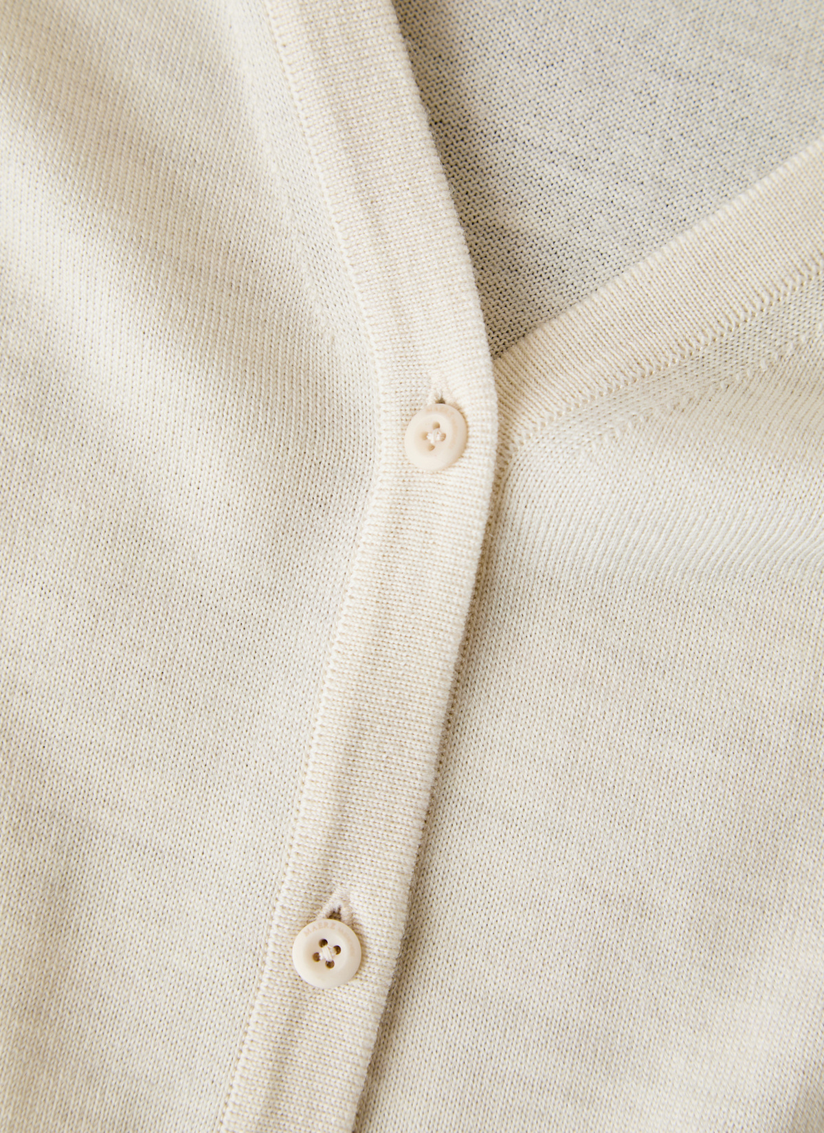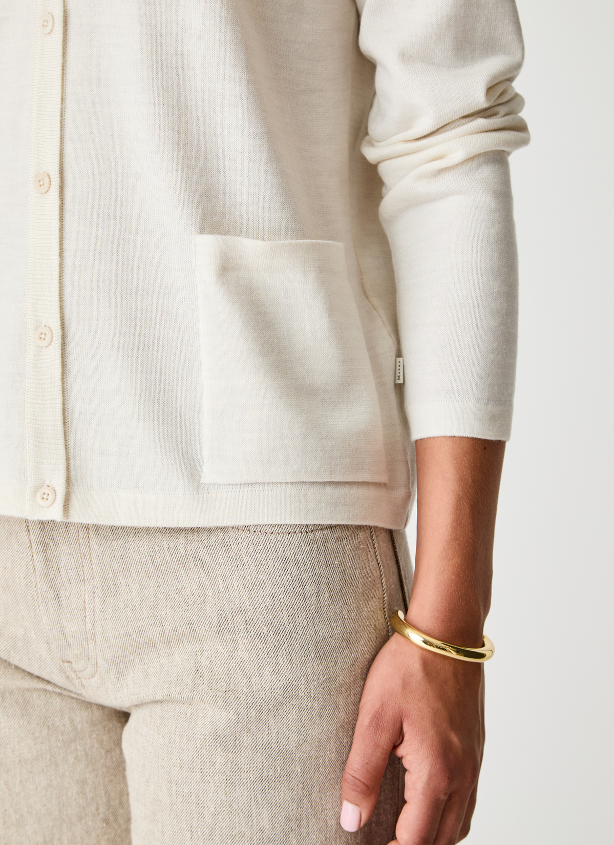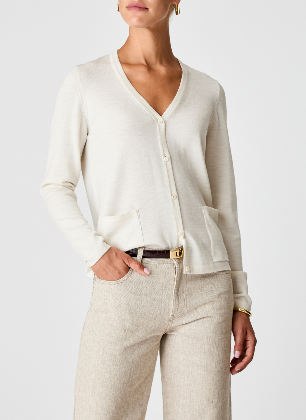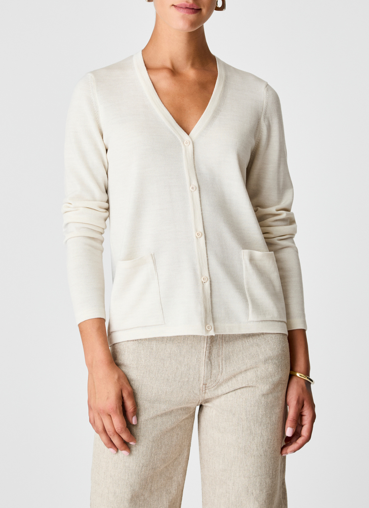 Diese feminine Damen-Strickjacke überzeugt mit einem klassischen V-Ausschnitt und einer dezenten Knopfleiste, die eine zurückhaltend elegante Ausstrahlung verleiht. Aufgesetzte Taschen setzen stilvolle Akzente und unterstreichen die zeitlose Optik. Der Regular Fit sorgt für eine ausgewogene Passform, die Komfort und Formbewusstsein harmonisch verbindet. Gefertigt aus hochwertiger Merinowolle ist die Strickjacke formstabil, feuchtigkeitsregulierend und angenehm weich auf der Haut. Ein stilvolles Essential für Frauen, die Wert auf Qualität, Funktion und zeitlose Ästhetik legen.