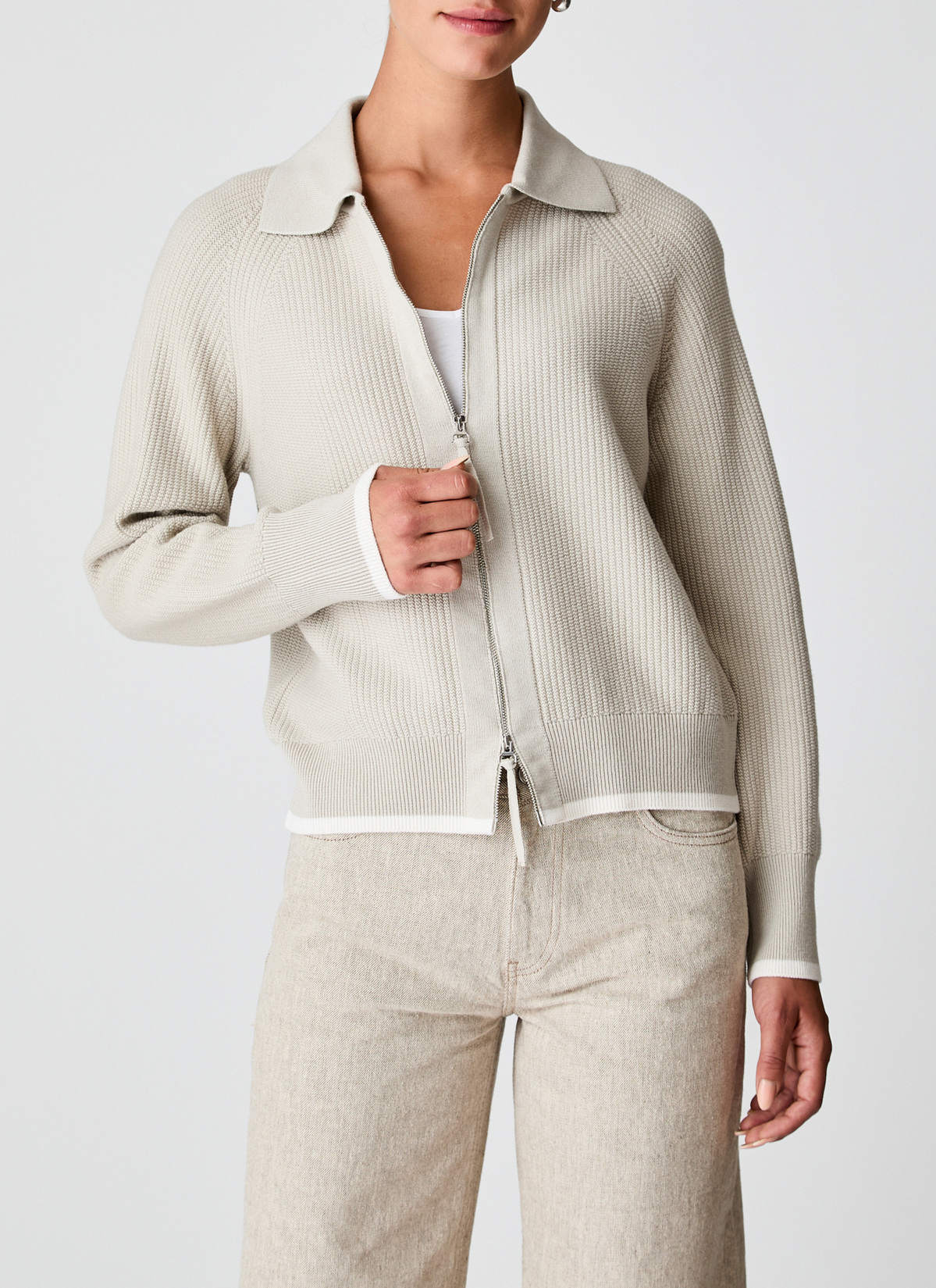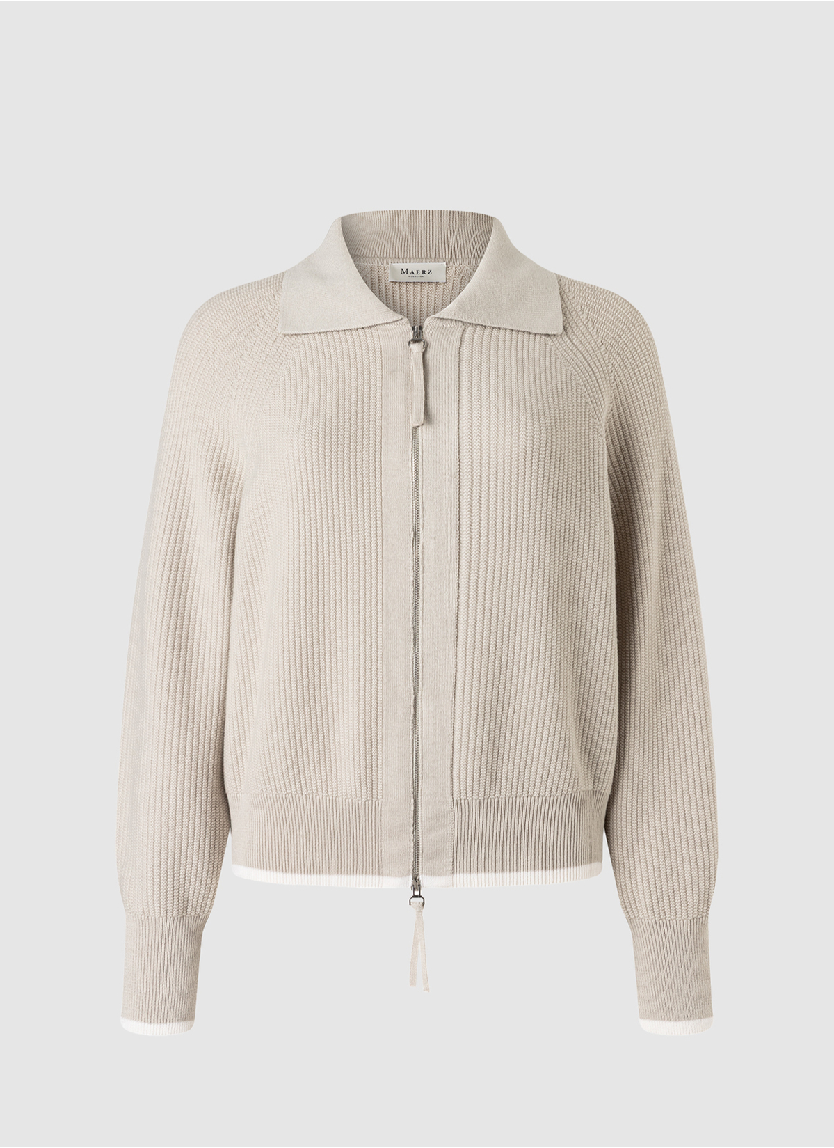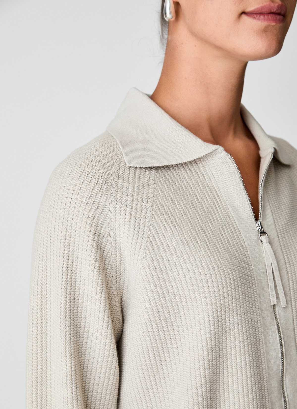 Diese Damen Strickjacke mit Reißverschluss und Umlegekragen verbindet sportliche Details mit modernem Komfort. Der lockere Schnitt, überschnittene Schultern und eine leicht voluminöse Form sorgen für eine lässige Silhouette mit viel Bewegungsfreiheit. Kontraststreifen am Saum setzen einen stilvollen Akzent und verleihen dem Design eine frische Note. Die hochwertige Mischung aus Schurwolle und Baumwolle ist atmungsaktiv, temperaturregulierend und angenehm weich – ideal für kühlere Morgen und wechselhafte Tage. Ein vielseitiges Layering-Piece für entspannte Looks mit modischem Anspruch.