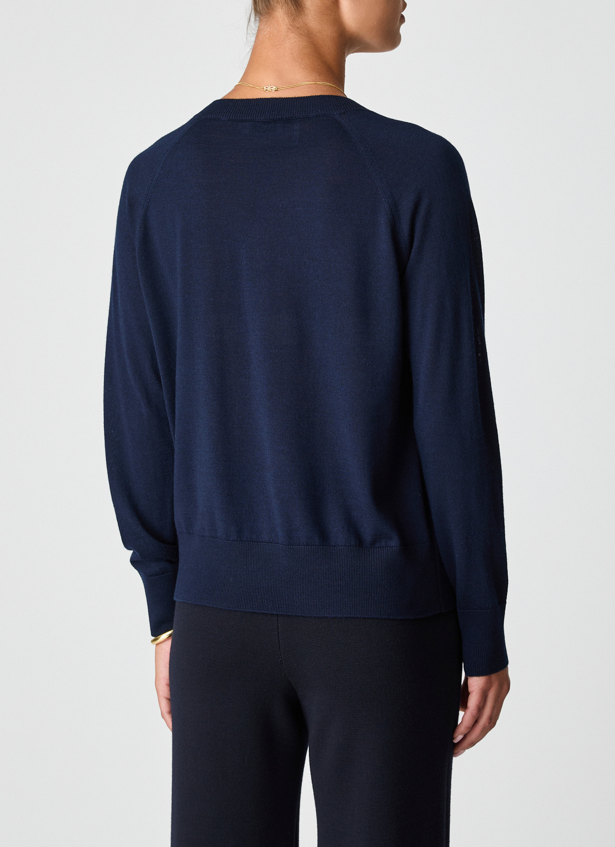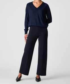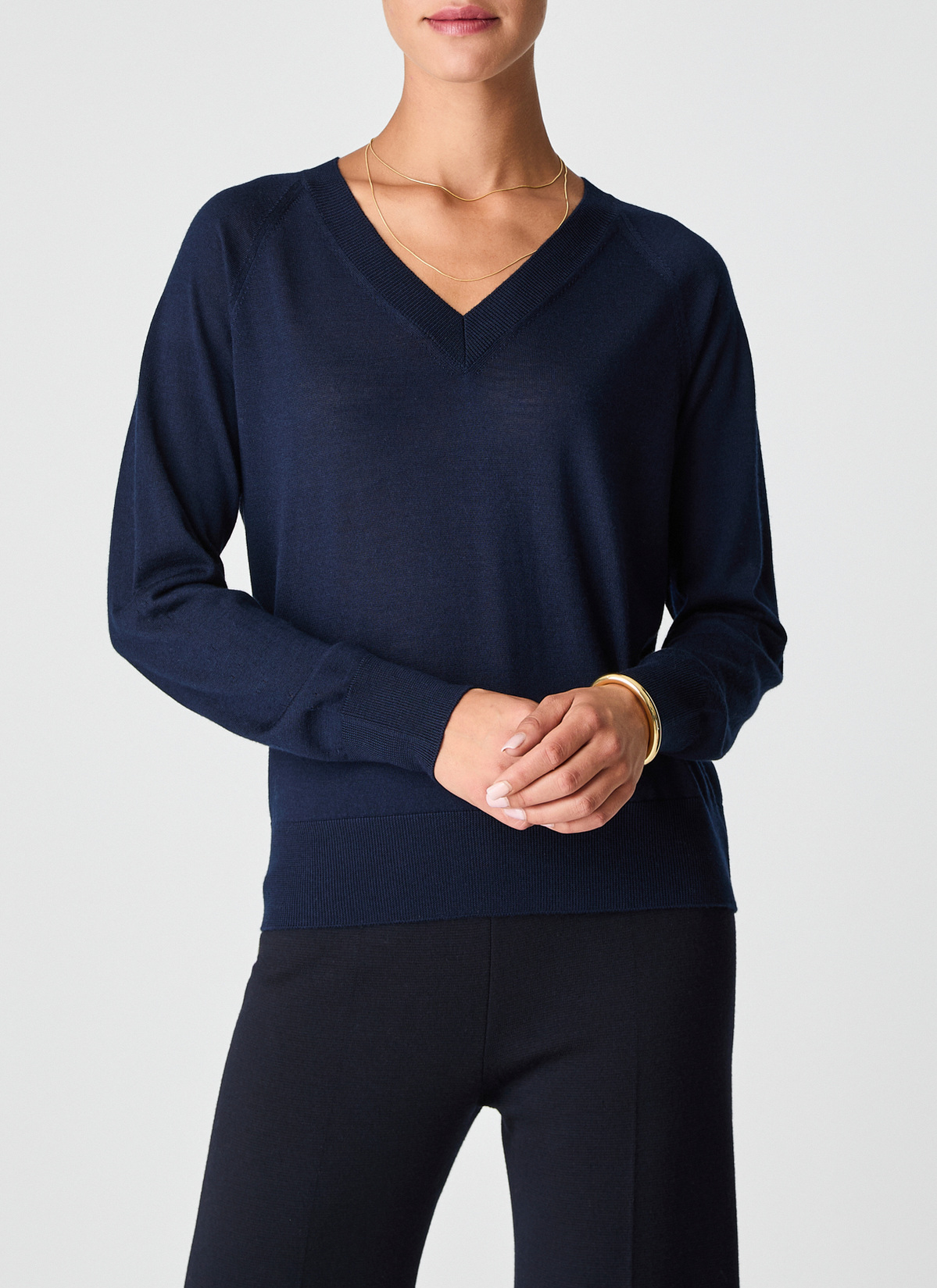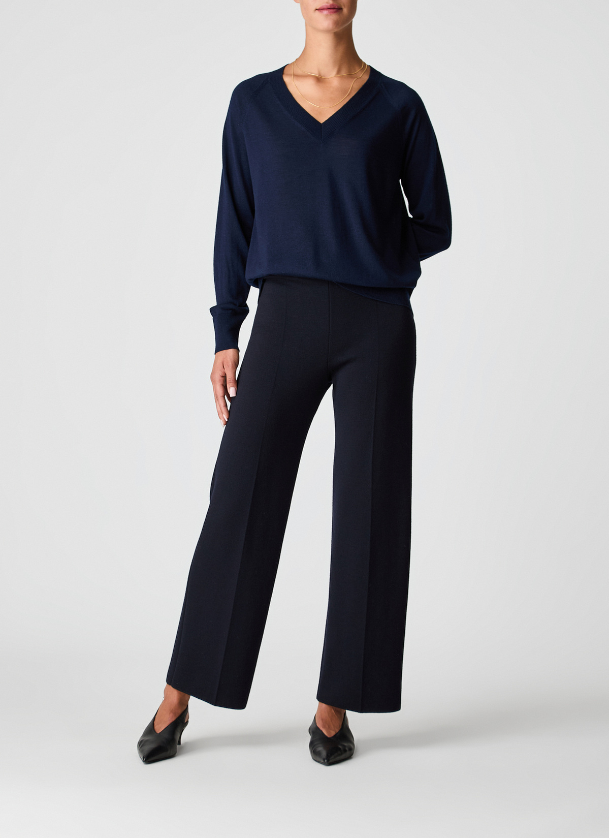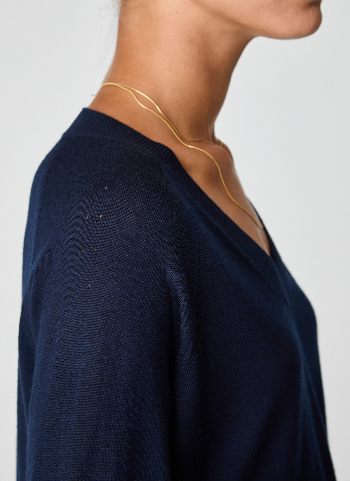 Dieser Damen Pullover mit Pointelle-Details kombiniert zeitloses Design mit edlem Tragegefühl. Der V-Ausschnitt, die überschnittenen Schultern und der leicht voluminöse Schnitt verleihen ihm eine moderne, entspannte Silhouette. Feine Pointelle-Details an den Ärmeln setzen dezente Highlights und sorgen für eine feminine Note. Die edle Mischung aus Merinowolle, Seide und Kaschmir ist leicht, atmungsaktiv und wirkt angenehm kühlend – perfekt für warme Tage und wechselnde Temperaturen. Sie liegt weich und glatt auf der Haut und bietet den ganzen Tag über ein besonders komfortables Tragegefühl. Ein stilvolles Essential, das mühelos Eleganz und Leichtigkeit vereint.